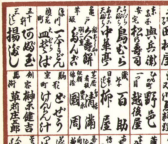 ちなみに横綱は東が鰻の神田川(神田)、西が同じく鰻を扱う竹葉亭(銀座)。張り出し横綱は天ぷらの中清(浅草)になっています。どれも今も老舗として続いている店舗ですね。