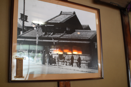 食べ終わっての帰りしな、横の壁を見ると、昔の店舗の写真が掲げられていました。戦争で焼ける前の店舗ですね(明治中期に建てられたものらしい)。これは重々しい。